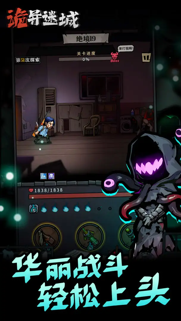 《诡异迷城》这是一款竖屏横版卷轴视角的放置ARPG刷宝游戏,玩法是玩家通过不断的闯关刷宝,再通过对装备、武器、道具等进行合理的搭配,以及多种不同途径强化自身,然后继续挑战更强大敌人,无限成长,数值爆表,摧枯拉朽,战胜无穷无尽的强敌!同时游戏拥有独特有趣的诡异能量系统,玩家在轻松放置战斗的过程中,仍然通过一些小小的微操技巧,加上那么一点点的运气,依然能够越级通关,快来试试吧!